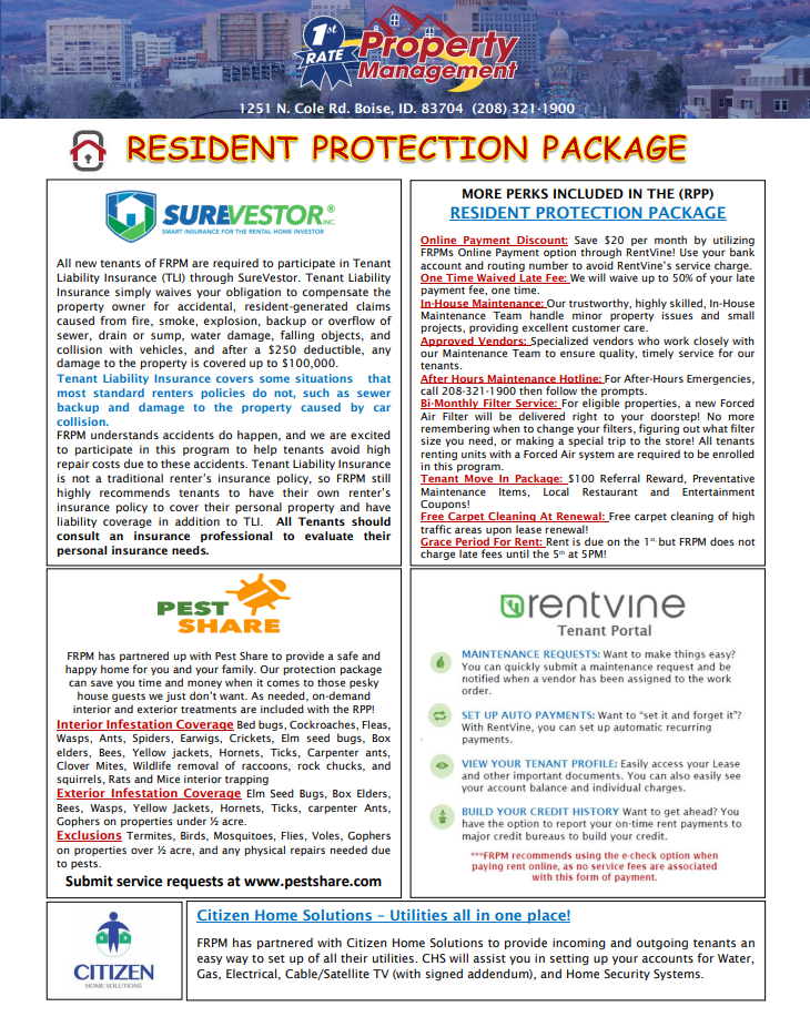 Disclaimer: First Rate Property Management is not responsible for any inaccuracies or misprints on this website and reserves the right to make changes without notice. All available rental units can be rented at any time and are considered available until an applicant is approved, the security deposit is paid with certified funds, and the lease is executed. We do not currently charge an application fee, however we do process first-come-first-serve. We will notify you via email or phone call when we have begun processing your application. We cannot guarantee your place in line. If you do not receive an email within one business day after you submit an application, it may be because there are already pending applications on the property, the property has already rented, or if the application requirements/instructions were not followed. In order to ensure you are first in line you can pay the security deposit and sign a contingency lease, assuming no other applicants have done so yet. All availability dates are approximate and not guaranteed. Listed rents include a $20 discount for going 'Green' (paperless) with First Rate Property Management. The advertised rent price DOES NOT include $40/month required enrollment in resident protection program, which protects the property against unintentional tenant damage, pest infestations, and filthy air flow, and includes utility concierge service through Citizen Home Solutions.