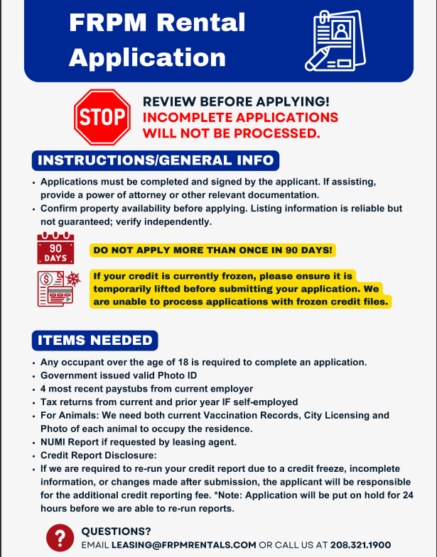 To get additional information or to set up a showing, email Leasing@frpmrentals.com or call our office at 208-321-1900!
